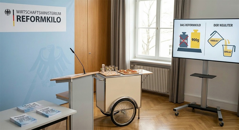 Ein der MamM vorliegender Referentenentwurf des Wirtschaftsministeriums sieht nun vor, die seit 1793 bestehende historische Einteilung des Kilos auf 1000 Gramm endlich zu kippen. Dieser Anachronismus sei heute nicht mehr zeitgemäß, logisch nicht zu begründen und man müsse es, auch mit Hinsicht auf die Leistungsfähigkeit der Wirtschaft, wagen können, neue Wege zu beschreiten, sagte Reiche. So sei eine gesetzliche Reform des Kilos auf vorerst 900 Gramm alternativlos, könne aber nur ein erster Schritt auf dem Weg zur Konsolidierung der deutschen Wirtschaft sein.