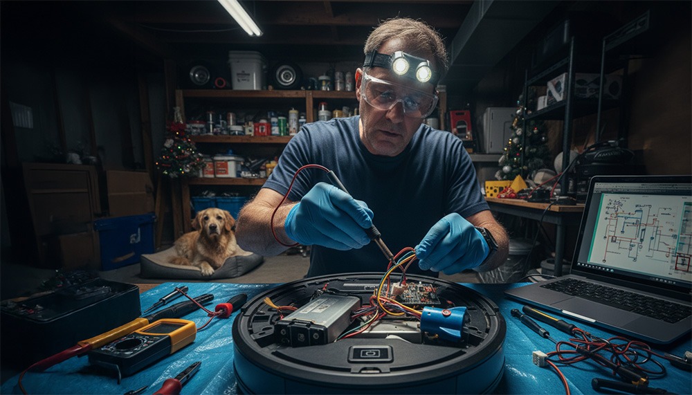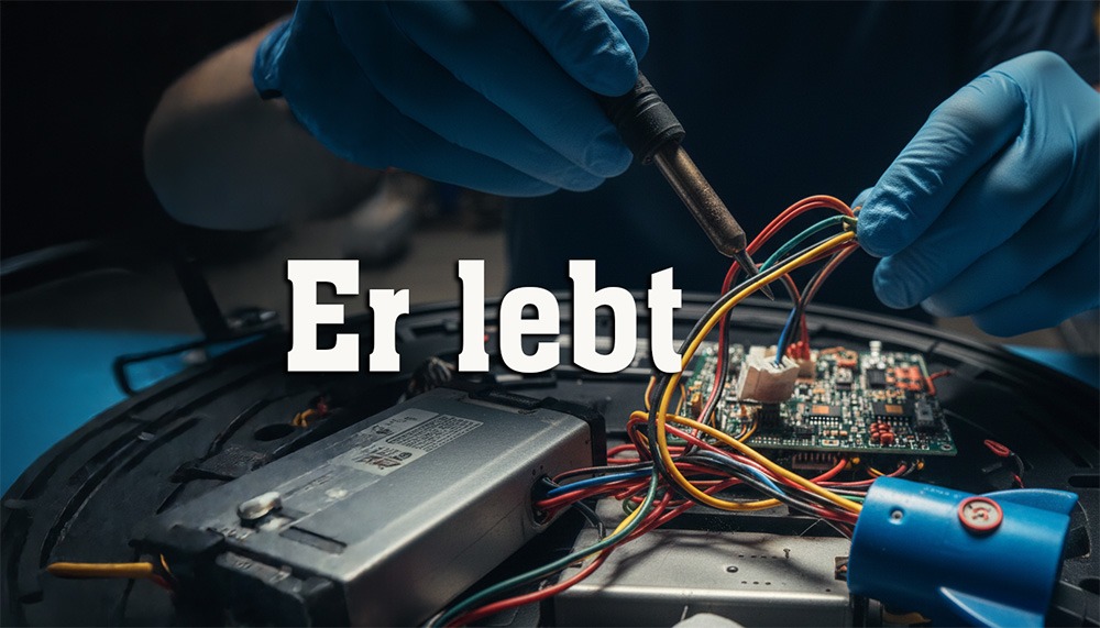 Ein Problem hatte ich noch: Der Stecker war nicht kompatibel. Im Keller wurde flux ein OP-Saal eingerichtet. Saugi wurde auf den Rücken gelegt, geöffnet und das Herz entfernt. Nun kam der heikle Teil: Am Spenderakku waren, wie am Original, zwei gelbe Drähte, ein blauer und ein schwarzer. Wie ein Bombenentschärfer musste ich mich entscheiden: ein gelber oder der schwarze oder der blaue …? Welcher zuerst …? Konnte ich die Stummel richtig an den alten Stecker verlöten? Bange Stunden hatte ich zu bewältigen. Ich fügte alles wieder zusammen, ohne die obligatorische übriggebliebene Schraube, und schaltete ihn ein. Und Saugi sprang an. So, hoffe ich, bleiben uns noch viele wunderbare Jahre.