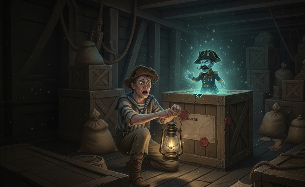 Die „Markscheid“ schlingerte auf dem Pazifik, ein einsamer Punkt zwischen zwei Unendlichkeiten: dem blauen Himmel und der noch blaueren See. Unter Kapitän Knust, dessen Gesicht so wettergegerbt war, dass man darauf eine Landkarte hätte einzeichnen können, befand sich die Crew auf einer Reise von Valparaíso nach Königsberg. Die Ladung? Eine mysteriöse Kiste, versiegelt mit kaiserlichen Siegeln und dem Vermerk „Vorsicht! Inhalt nur für den allerhöchsten Gebrauch des Königs bestimmt. Keinesfalls schütteln oder besingen.“