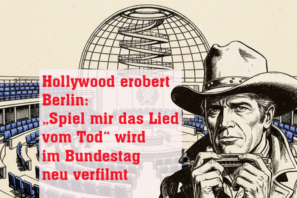 Berlin (dpoi) – Gänzlich unerwartet wurde heute bekannt gegeben, dass die lang erwartete Neuverfilmung des Western-Klassikers „Spiel mir das Lied vom Tod“ (Originaltitel: „Once Upon a Time in the West“) während der kommenden Winterpause im Plenarsaal des Deutschen Bundestages gedreht werden soll. Regie führt der international gefeierte Arthouse-Regisseur Jean-Luc von der Spree, bekannt für seine experimentellen Ansätze und seine Vorliebe für lange, bedeutungsvolle Schweigeminuten.