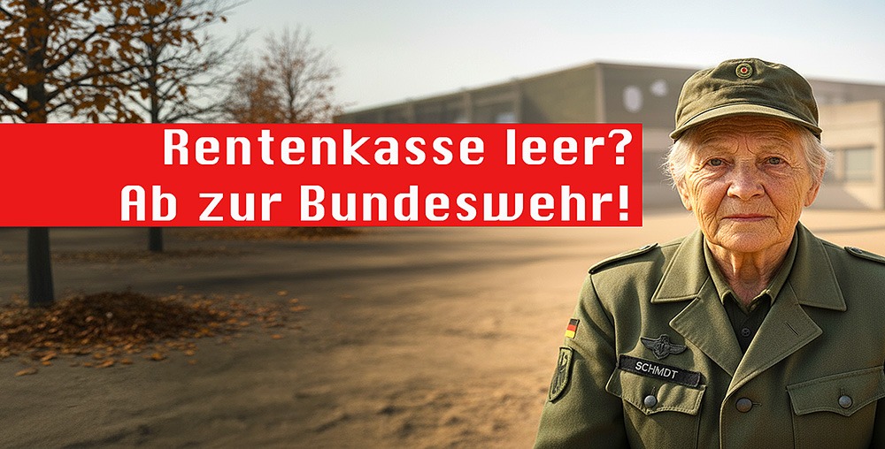 Berlin (dpoi) – Die Hiobsbotschaften zur gesetzlichen Rente reißen nicht ab: Demografischer Wandel, leere Kassen, Generationenvertrag vor dem Kollaps. Doch anstatt das Renteneintrittsalter auf „bis zum bitteren Ende“ anzuheben, präsentierte die Bundesregierung gestern einen revolutionären Ausweg: Die Einführung des „Senioren-Wehrdienst-Plus“ (SWD-Plus). Unter dem kühnen, neuen Motto: „Rentenkasse leer – dann geh doch zur Bundeswehr!“